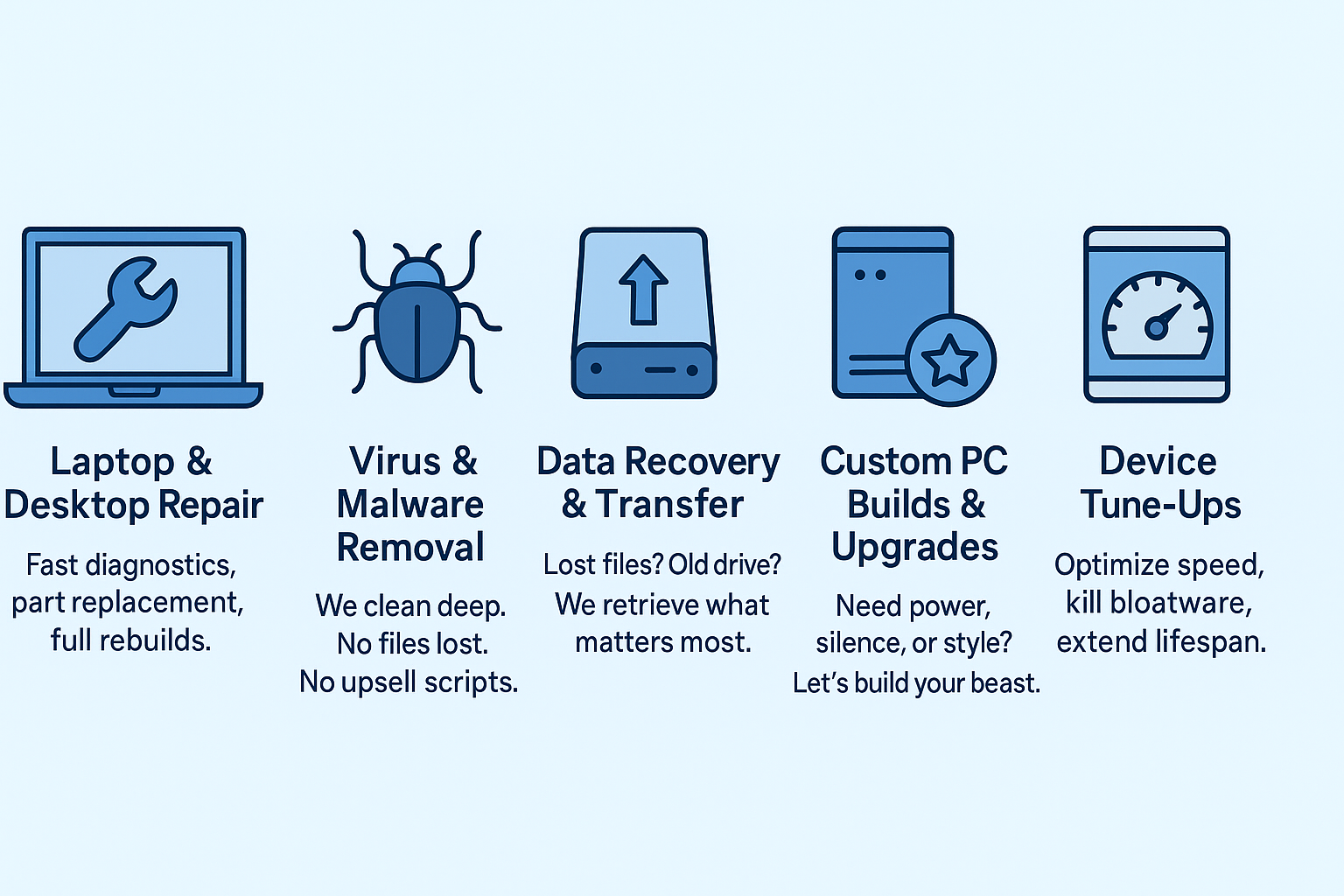 Whether it’s a laptop that won’t start, a virus that won’t quit, or precious files you thought were gone forever, I’m here to bring your tech — and your trust — back online. This is hands-on, honest repair work, backed by real experience and a genuine care for the people I help.
